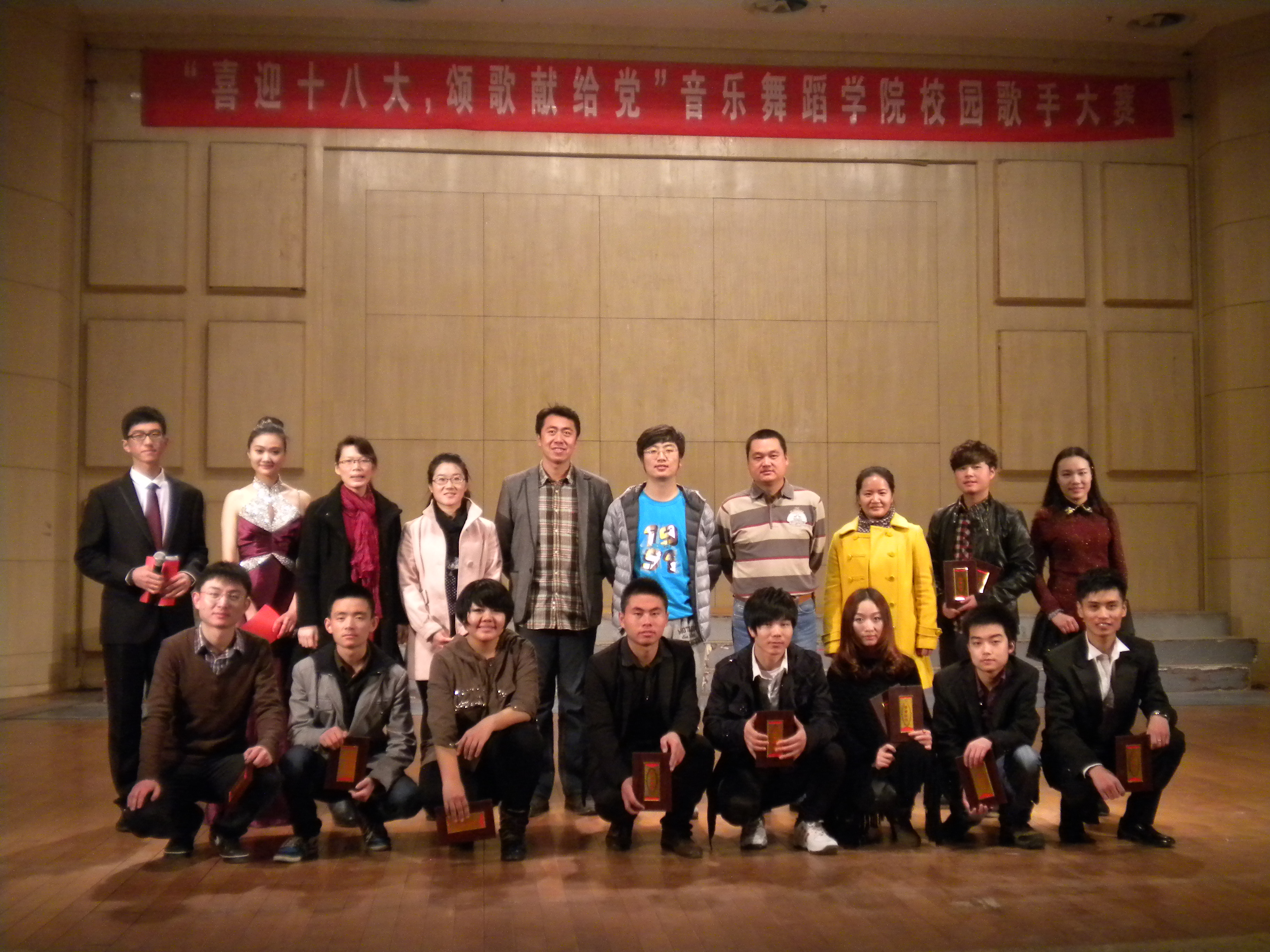 11187点半,在音乐舞蹈学院音乐厅,举行了音乐舞蹈学院喜迎十八大,颂歌献给党第二十届校园歌手大赛决赛。大赛由付越、雷蕾主持。我院左明阳、李云、李娜娜、李萌老师担任评委,院团委书记郭文芳、12级辅导员宋军丽老师及学生500余人观看了此次比赛。