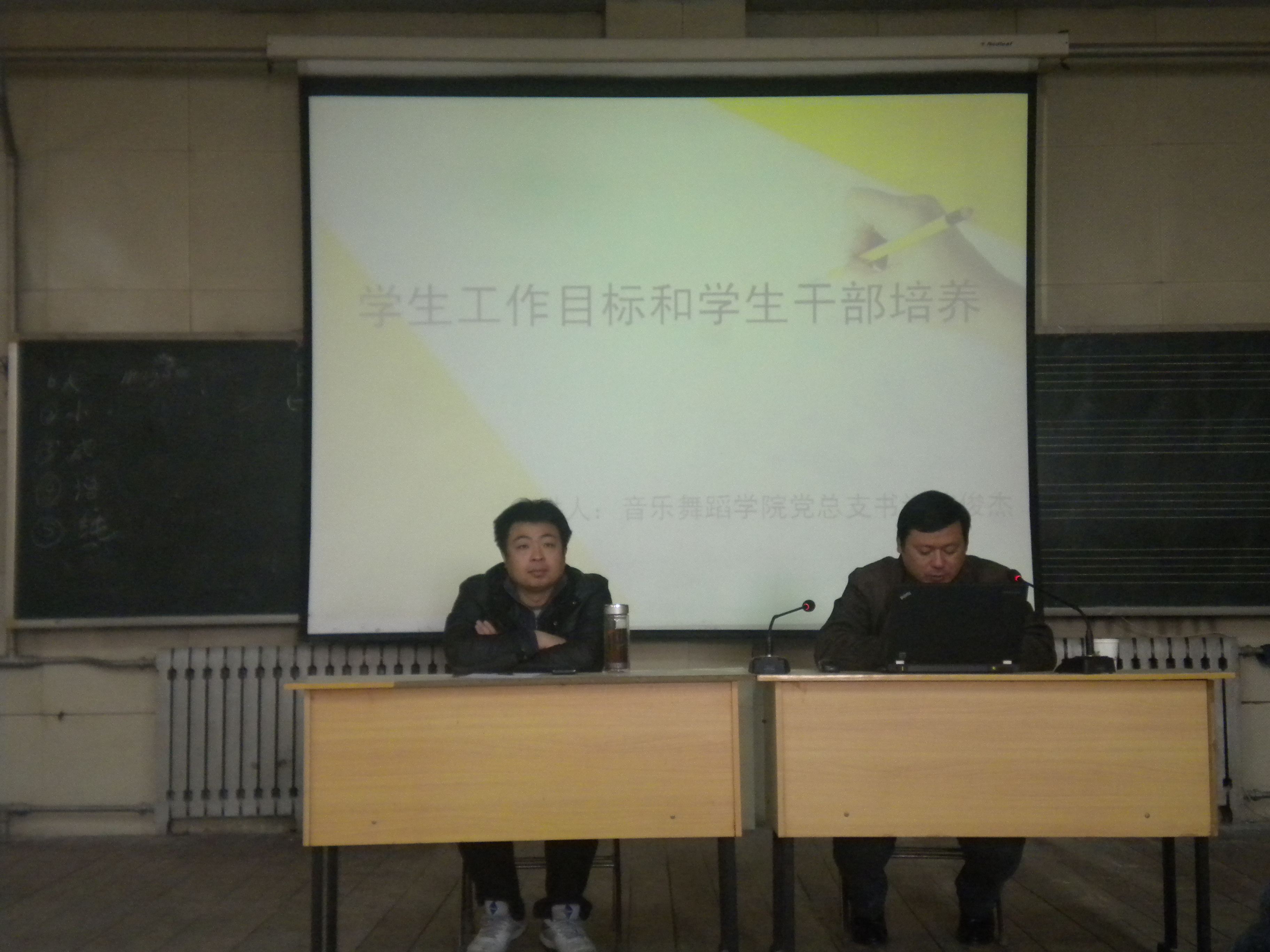 活动共分两场。上半场由音乐舞蹈学院新任党总支书记陈俊杰对学生干部进行培训。活动伊始,首先,由郭文芳老师对党总支陈书记进行了介绍,之后,培训正式开始。陈书记首先针对“什么是学生工作的目标,学生干部培养的意义”等问题进行了讲解,他讲到,学生干部是联系学生管理部门和学生之间的桥梁和纽带,要经常开展素质教育,提高学生抗挫折能力等。接着,陈书记就“学生干部怎样提高自身能力”展开了教育,他提到,学生干部要从提高执行力、主动力、理解力、创造力等方面来强化自己,并从“三心”“四勤”“五种关系”“六种能力”等方面对同学们进行了深刻的教育,陈书记的这些话仿佛是一缕春风,瞬间使同学们豁然开朗。下半场由董书记对学生进行培训,董书记采用与学生干部互动的方式,告诉学生要在自己的工作中找不足,并教导学生干部要把个人素质的提高放在第一位,找准工作效用,在工作中养成创新的好习惯。这些话使同学们受益匪浅。