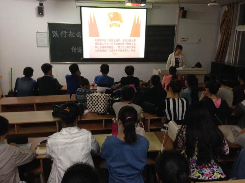 首先,主持人开始播放幻灯片,向大家讲解了团的基础知识,是新团员了解什么是共青团,加入共青团的条件及什么是团旗、团歌和团徽。随后,主持人让同学清楚的了解了团员额权利和义务。新团员懂得了什么事共青团的任务,什么事共青团员的任务和权利,以及团内的惩罚和奖励措施。五四运动作为一场学生领导的,彻底的,不妥协的反帝反封建运动,其开始的过程和意义都是新团员们必须熟知的,因此,主持人也为同学们清楚的讲解了有关五四运动的知识。最后,全体人员在朗朗的宣誓声中,把活动推向了高潮。