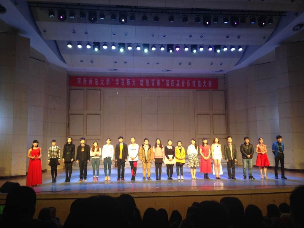 2014年11月27日晚19点30分,河南师范大学“学在师大,绽放青春”第四届音乐技能大赛专业组通俗组决赛在音乐厅成功举行。本次活动有幸邀请了台湾忠信学校董事长苏龙德老师和忠信学校学生访问团的同学们,以及校园国际合作与交流处处长李秋发主任,担任本次比赛的评委老师有:音乐舞蹈学院李彩虹老师、庞洁老师、郝静老师、王冬雪老师、李萌老师、殷翰老师。