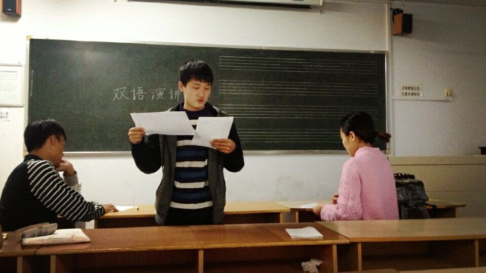 4月20日晚6点30分,双语演讲比赛初赛在音乐舞蹈学院举行。此次比赛由2013级辅导员胡明钊和广播站的两位学长学姐担任评委,参赛选手为音乐舞蹈学院同学。 比赛开始前,组织者先宣布了评分规则,让选手们更加明确自己的得分方向。始,参赛选手陆续比赛开上台进行演讲,演讲内容多有关于青春、励志。有的选手略微紧张,言语断续;有的选手神态自如,富有情感。其中13级高胜男同学演讲的《祖国师大 我们正青春》令我印象深刻。这位同学声音洪亮,每一字每一句都仿佛充满了力量,声情并茂,有起有伏,好似一汪春水,又似搏击海岸的波浪,轻易地把听众拉入她所描绘的内容中去。最后,三位评委对此次演讲比赛进行了点评和总结。告诉我们演讲是一个与听众交流的过程,演讲时要自信,注意“演”、“讲”结合。 此次演讲比赛给同学们提供了一个锻炼自己的机会,展现自我的平台,在竞争中学会激励自己,奏响属于我们的青春乐章。 (音乐舞蹈学院 李曼)