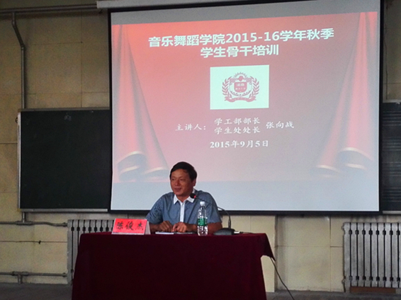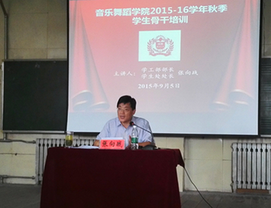 2015年9月5日早8点,音乐舞蹈学院在音乐楼501教室举行新学期学生骨干培训。本次培训由我校学生部部长、学生处处长张向战老师主讲。音乐舞蹈学院党委书记陈俊杰、团委书记郭文芳、各年级辅导员和学院全体党员及学生干部共同参加。