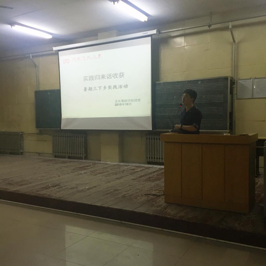 2015年10月11日19点30分,音乐舞蹈学院“实践归来话收获”暑期三下乡实践活动报告于音乐楼501室举办,参加报告会的有音乐舞蹈学院团委学生会全体成员及2015级全体学生。