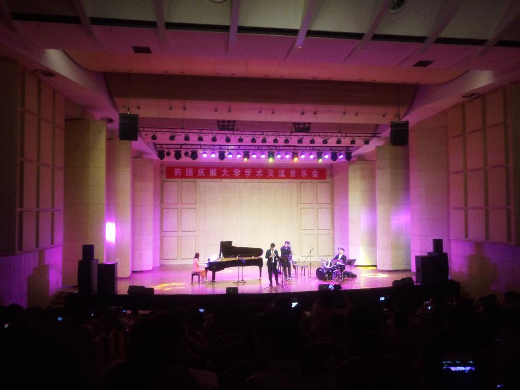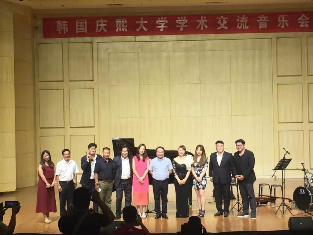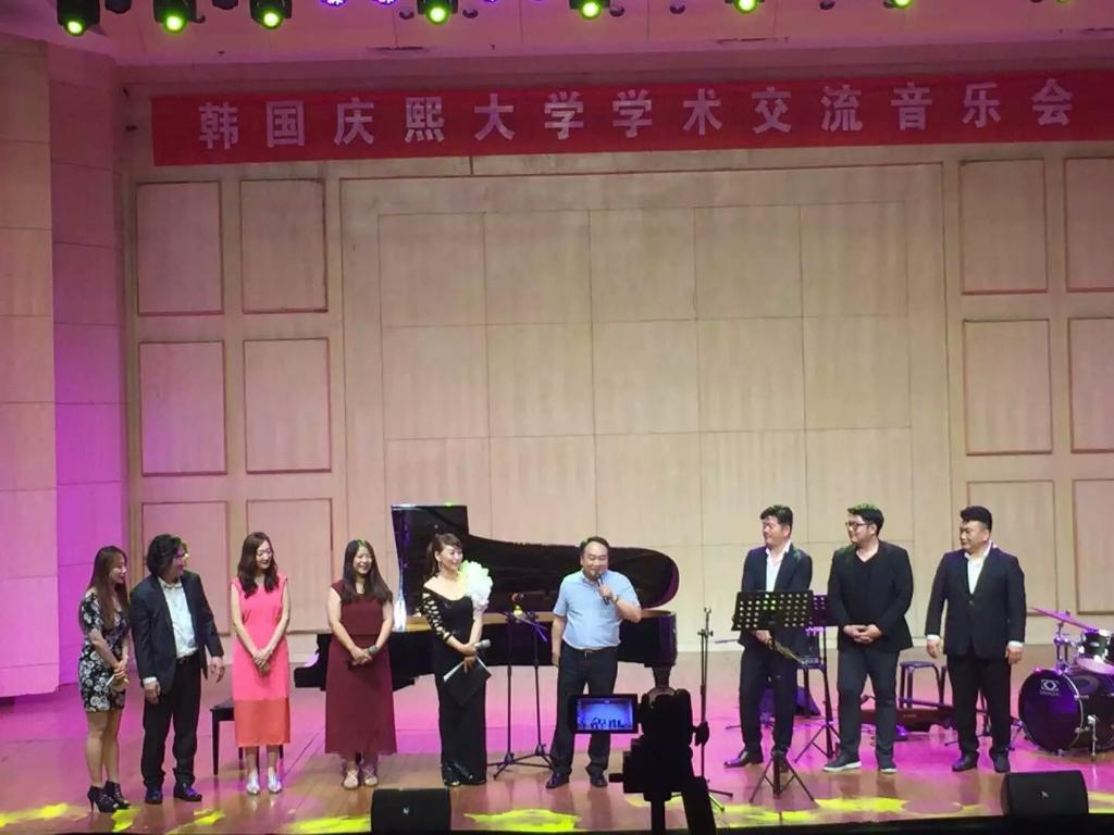 当日晚七点于音乐厅举行了韩国庆熙大学学术交流音乐会,音乐会以爵士钢琴经典曲目《Night and Day》《Habanera》开始,浑厚饱满的低音,透亮的高音,柔美过渡自然的中音,强烈的立体声,自由的节奏,引发了现场观众的热情;随后吉汉娜老师为我们演唱了歌曲《Oblivion》《Yo So Maria》,金仁珠老师也为我们演奏了自创曲目《Wonderful Day》和韩国民族歌曲《阿里郎》,整场音乐会以爵士钢琴为主,架子鼓,贝斯,萨克斯相互碰撞,组成了一场爵士乐的盛宴;最后音乐会在全体演奏人员以及音乐舞蹈学院院长段续老师合唱中国曲目《月亮代表我的心》中落下帷幕。
