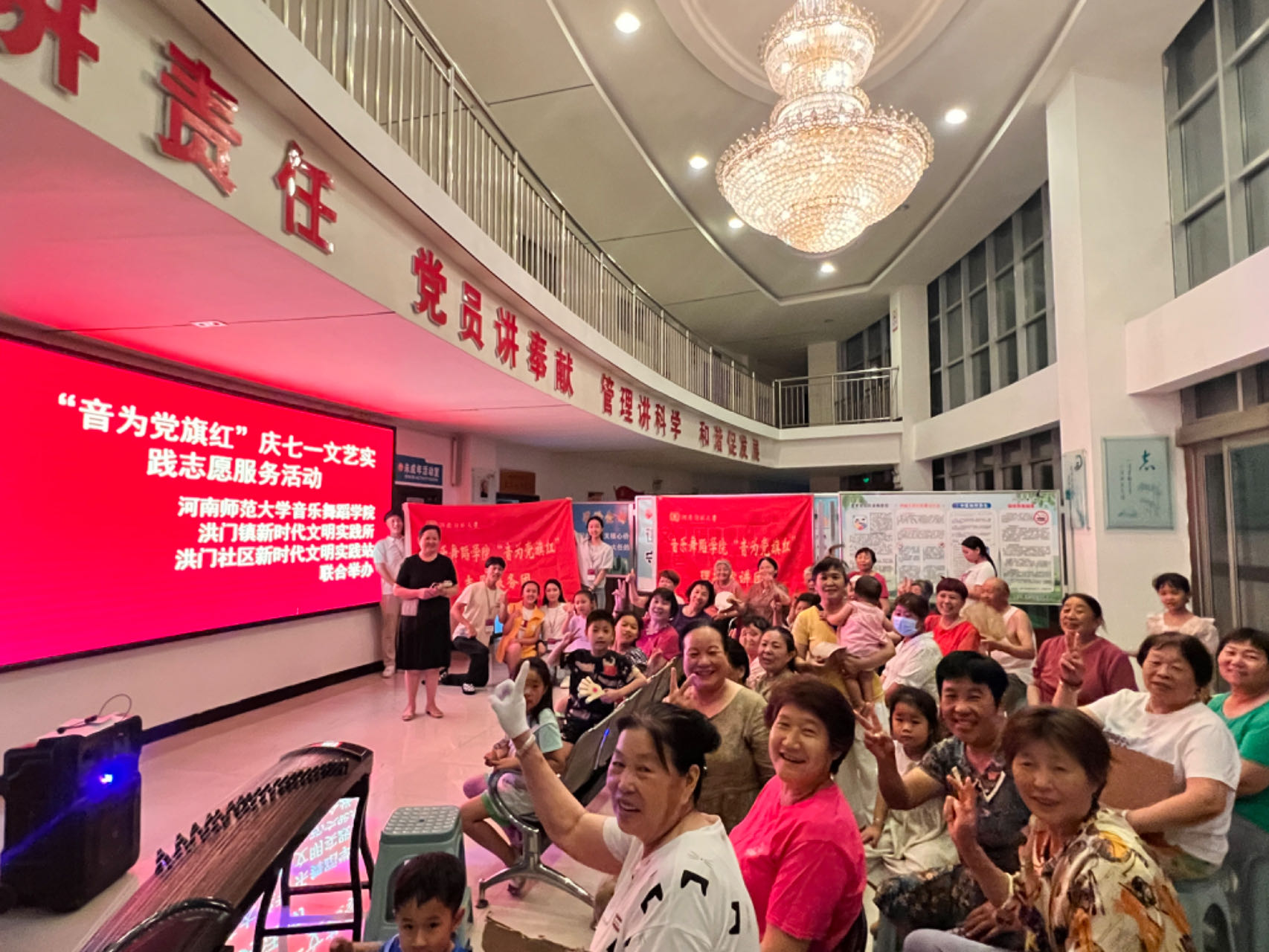 为深入学习贯彻习近平新时代中国特色社会主义思想,切实把党的二十大精神转化为做好专业实践和社会志愿服务的具体行动,6月30日晚,我院组织“音为党旗红”文艺实践志愿服务团深入洪门新型社区,开展“唱响主旋律 颂歌献给党”——“庆七一”文艺志愿服务活动。本次活动吸引了社区党员和居民100多人前来观看。