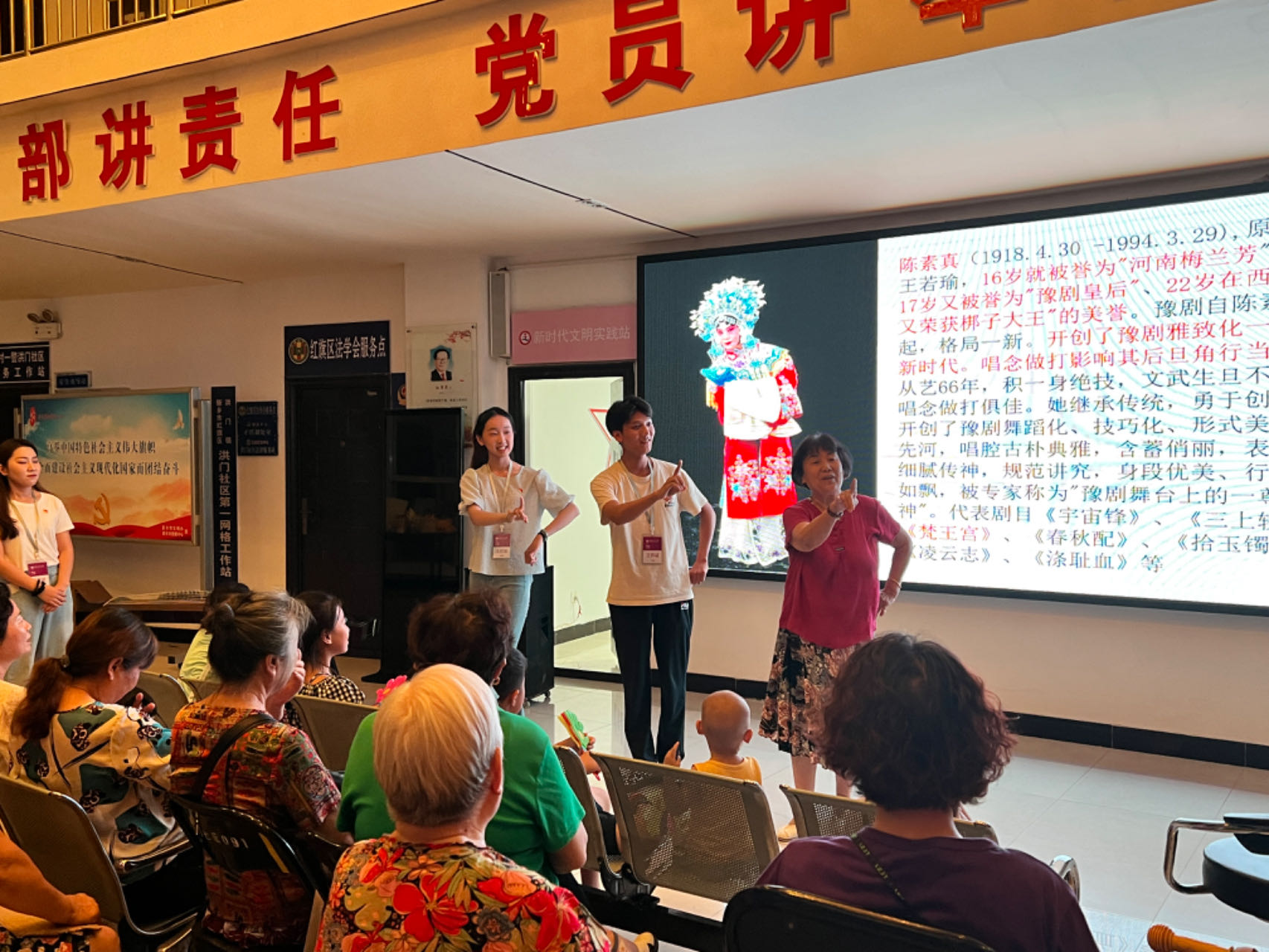 活动现场,学生志愿者以一曲家喻户晓的豫剧选段《穆桂英挂帅》拉开了整场活动的序幕,并现场示范演绎戏曲的身段步伐和唱腔,台上志愿者讲得生动、唱得精彩,台下居民看得入迷、听得陶醉。其间,志愿者们还现场邀请社区居民同台竞技,不时迎来台下阵阵掌声。伴随着古筝悠扬的琴声,活动在全体大合唱《唱支山歌给党听》中落下了帷幕。志愿者吴光耀表示,豫剧艺术作为我国传统文化中的重要组成部分,青年群体有着义不容辞的传承责任。社区负责人陈洪萍说道,此次文艺志愿服务活动大大地丰富了社区居民的精神文化生活,让乡亲邻里得以聚在一起品尝“文化大餐”。