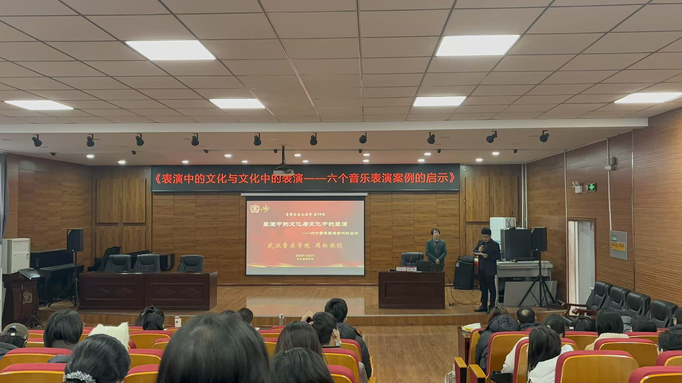 1月26日上午,武汉音乐学院周耘教授应邀做客“音舞名家大讲堂”,作题为《表演中的文化与文化中的表演——六个音乐表演案例的启示》的学术讲座。本次讲座在学院501报告厅举行,由副院长(主持工作)罗强主持,学院全体教师及部分研究生到场聆听。