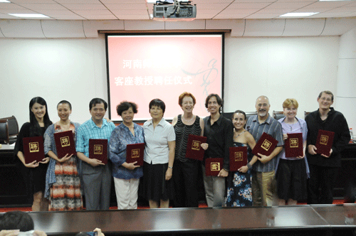 葛锐·胡丽翰(Gerri Houlihan)代表受聘专家发言,她说他们非常荣幸受聘为河南师范大学客座教授,他们在这里教学和生活都很愉快,他们真切感受到了学校的热情,表示十分愿意继续与我校合作,使中国现代舞事业从河南师范大学发展壮大。