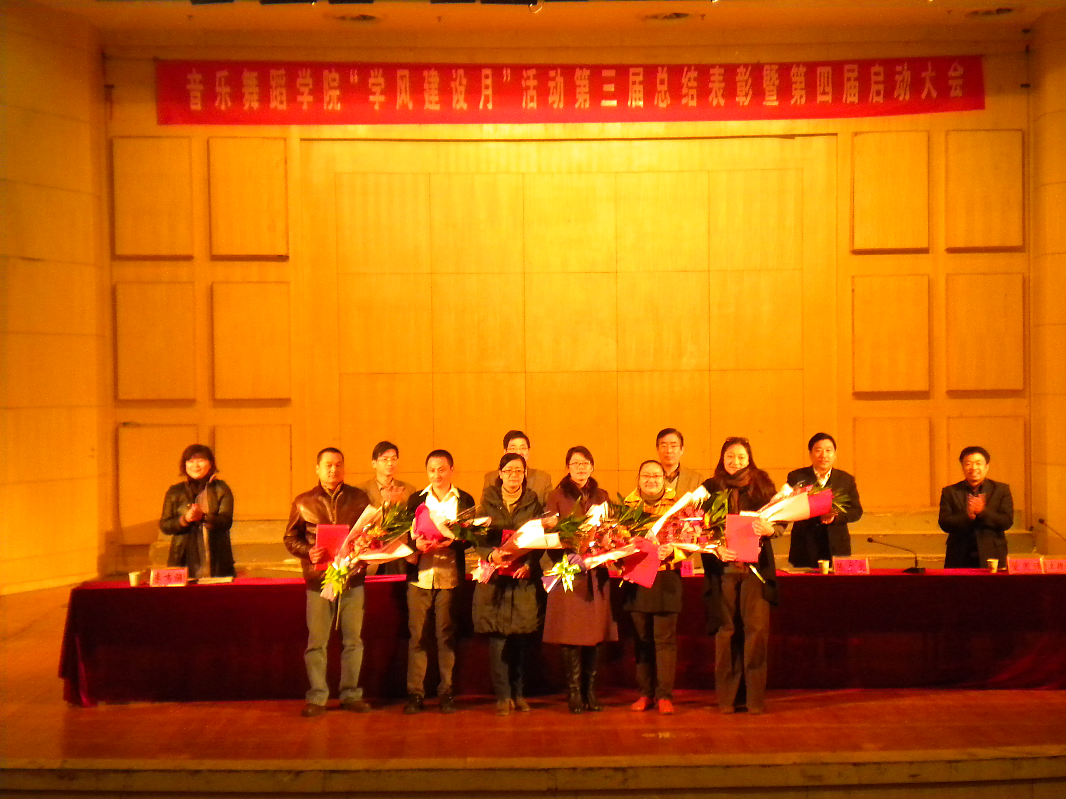 陈广文处长宣布“我心中的好老师”教师获奖名单,张向战处长宣布学生先进班集体和个人名单。全体参会领导为获奖师生代表颁奖。由我院学生评选的“我心中的好老师”代表左明阳老师及学生代表张惟分别发言,表示会做出自己的贡献,为学院的发展增添力量。副院长李鸣镝宣布学院第四届“学风建设月”活动方案。最后,孙先科副校长对我院“学风建设月”活动取得的各项优异成绩表示肯定,并提出希望与要求:站位高远、胸怀全局,坚定信念、跨越发展,崇尚学习、提升素质,希望音乐舞蹈学院能够承载繁荣校园的责任,继续坚持差异化竞争发展,不断创先争优,为我校即将进行的90周年校庆献礼。