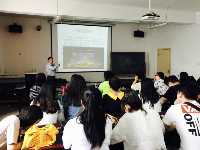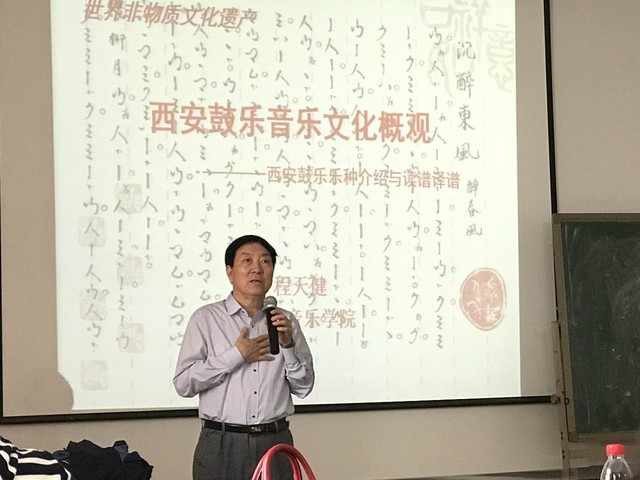 西安鼓乐,民间原以“乐器”、“细乐” 称之,是中国传统器乐吹打乐的一种。主要流传于西安城乡地区及沿终南山麓一带。西安鼓乐源于唐、起于宋,兴于元明,盛于清,经过千余年的传承与发展,特别是明清以来逐渐形成了完整的大型套曲的音乐形式。中国传统音乐中的许多因素如:谱、器、律、调、曲、词以及演奏形式、曲体结构、调式调性等等,都在这个古老乐种中留下了遗迹残痕,因此西安鼓乐被称之为中国古代音乐的“活化石”。2009年10月西安鼓乐入选联合国教科文组织“人类口头与非物质文化遗产代表作”名录。讲座中程老师带领全体师生演唱相关谱例,使在座的老师和同学对俗字谱有了更加深入的了解。