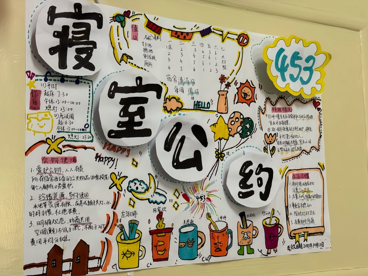 本次活动以宿舍为单位展开,学生围绕共同愿景,友好协作,合力创作《宿舍公约》手抄报,以此展示宿舍独特风采。在协商共建环节,各宿舍成员通过充分讨论与民主表决确定公约内容,确保其真正体现集体意愿。公约内容涵盖生活作息、值日安排及公物使用规范等方面,贴近实际、切实可行。进入设计制作环节,同学们充分发挥创意,通过合理划分板块、巧妙搭配色彩、灵活运用艺术字等方式,精心提升手抄报的视觉效果。这一过程不仅锻炼了大家的审美与协作能力,更深化了对公约内容的理解,从而进一步增强了未来遵守规则的自觉性。各宿舍的《宿舍公约》经全体成员一致审议通过后,被张贴于宿舍醒目位置,成为维护宿舍和谐与整洁的重要遵循。经过严格的现场检查与线上评比,活动最终评选出一等奖3名、二等奖5名、三等奖8名,通过表彰先进,发挥其示范引领作用。