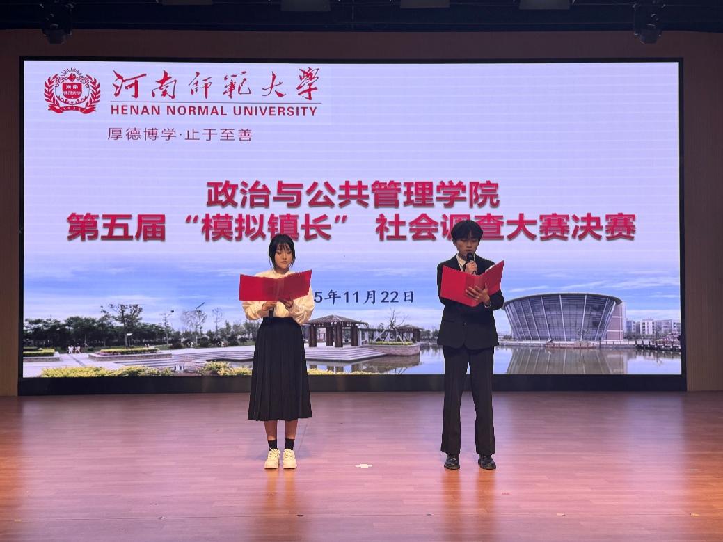 为积极响应党的二十届四中全会号召,践行立德树人使命,引导青年学子走基层、识国情、强本领,11月22日晚,我院在西校区学苑餐厅三楼青益空间成功举办第五届“模拟镇长”社会调查大赛决赛。新乡市人大常委会调研室宣传科三级主任科员杨旭龙、新乡市农业农村局秘书科科长李新亮、新乡市住建局住房保障科副科长阮琪发、新乡市行政审批局12345热线中心业务负责人刘红杰、新乡市卫滨区自由路街道党工委书记李帅军、新乡市卫滨区铁路西街道党工委书记陈晖、新乡市延津县石婆固镇纪委书记王永川、校团委副书记唐新、学院院长韩万渠、学院副院长原晶晶,出席大赛并担任评委,学院200余名师生到场观摩。