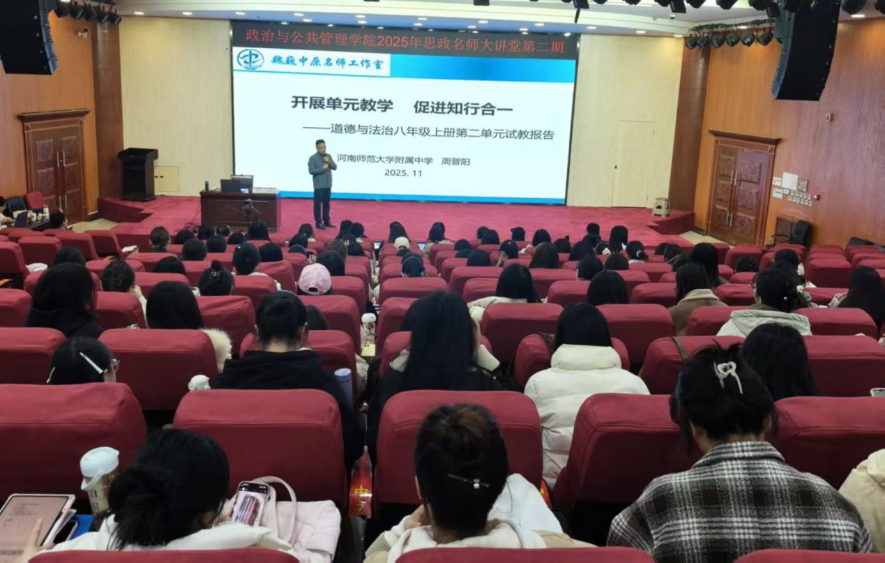 11月21日上午,学院于求是东楼思想政治理论课实践教学平台举办了2025年第二期“思政名师大讲堂”活动。本次活动采取线上与线下相结合的方式,特邀河南省骨干教师周晋阳担任主讲嘉宾,学院青年教师、2024级和2025级学科教学(思政)专业全体研究生、其他专业的研究生共同参与了此次活动。活动由学院田甲乐副教授主持。