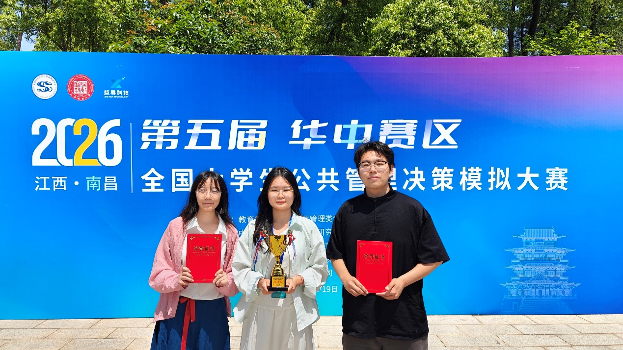 2026年4月18日至19日,第五届全国大学生公共管理决策模拟大赛(华中赛区)在江西南昌顺利举行。我院派出由薛志斌、王亚琪老师指导,2024级行政管理专业王昊亮同学,城市管理专业张风景、吴梦雨同学组成的代表队参赛。经过激烈角逐,我院代表队凭借扎实的专业功底、出色的团队协作和稳定的临场发挥,荣获华中赛区二等奖。薛志斌、王亚琪老师荣获“优秀指导教师”称号。