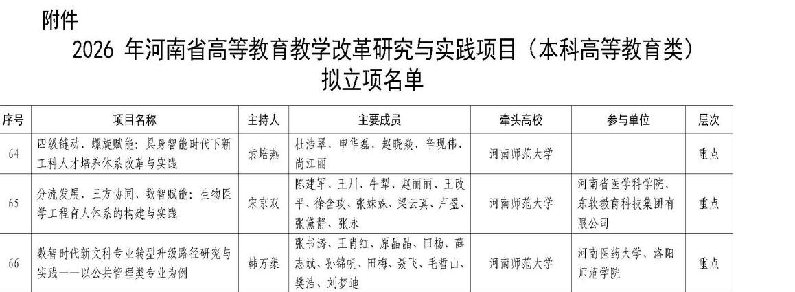 近日,河南省教育厅公布了2026年河南省高等教育教学改革研究与实践项目(本科高等教育类)立项名单,我院韩万渠教授主持申报的《数智时代新文科专业转型升级路径研究与实践——以公共管理类专业为例》成功获批重点项目。