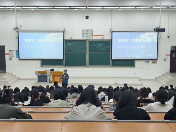为保障“三笔字”校级比赛顺利开展,切实做好赛事各项服务保障工作,4月22日晚,学院于文昌楼102室举办“三笔字”校赛志愿者专项培训会,学院团委副书记王鸿飞,学院研究生、本科生共计三百余人积极参会。