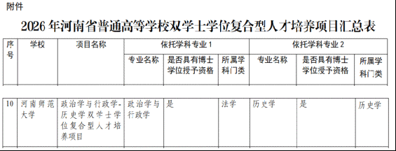 近日,河南省学位委员会、河南省教育厅发布《关于河南省2026年双学士学位复合型人才培养项目名单的公示》。根据《河南省学士学位授予管理办法》(豫学位〔2025〕3号)及省学位办相关通知要求,经学校申请、专家评审,同意郑州大学等高校11个双学士学位复合型人才培养项目立项。河南师范大学申报的政治学与行政学—历史学双学士学位复合型人才培养项目成功获批。