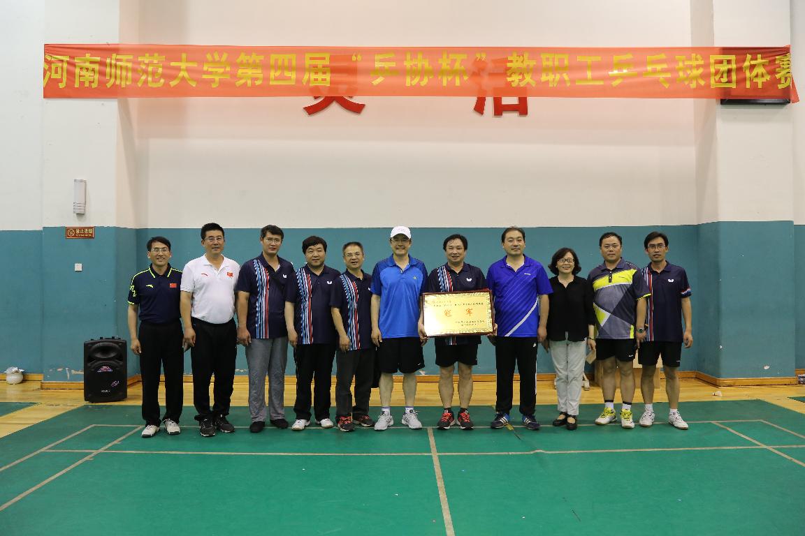 在刚刚结束的河南师范大学第四届“乒协杯”教工乒乓球团体赛中,我院教工选手经过奋力拼搏,荣膺冠军,实现学院乒乓球团体赛成绩的历史性突破。赛事结束后,校党委书记郑邦山、校工会主席岳杰勇、校体育运动委员会及体育学院负责人为我院代表队颁发了奖牌并合影留念。