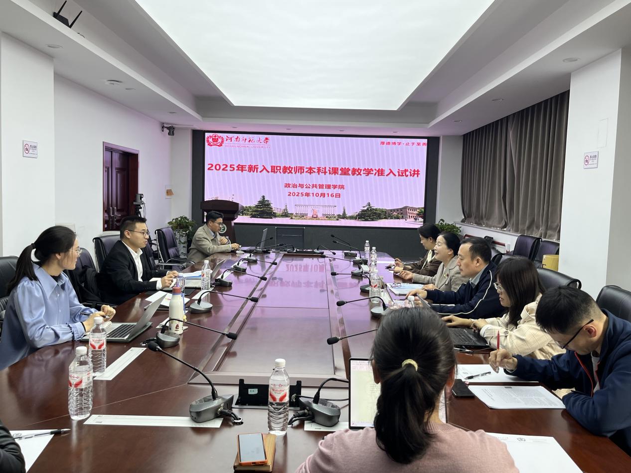 2025年10月16日下午,政治与公共管理学院2025年新入职教师本科课堂教学准入试讲活动于学院517会议室举行。孙锦帆、韩星耀、吕玉红三位新进教师依次参与试讲,校关工委张晓敏应邀指导,助课指导教师及学院同行督导韩万渠、王玲、余金刚、张立国、田杨、陈莉莉等教师参与评议。活动由副院长原晶晶主持。