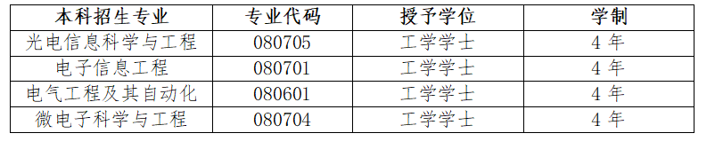 学院现设有光电信息科学与工程、电子信息工程、电气工程及其自动化、微电子科学与工程4个本科专业,其中,电子信息工程、光电信息科学与工程2个专业获批国家一流专业建设点。形成了以光电技术为核心、电子与电气工程协同发展的优势学科生态,专业集群特色鲜明、整体实力突出,人才培养质量获得社会广泛认可。