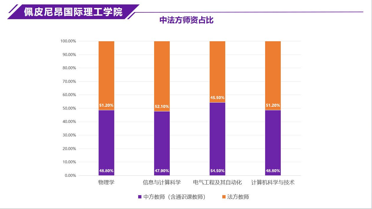 融合河南师范大学与佩皮尼昂大学两校优质师资,各专业中法师资比约1:1,中法双方师资团队教师均具备博士学历且皆具有副教授及以上职称,教学经验丰富,科研能力强。