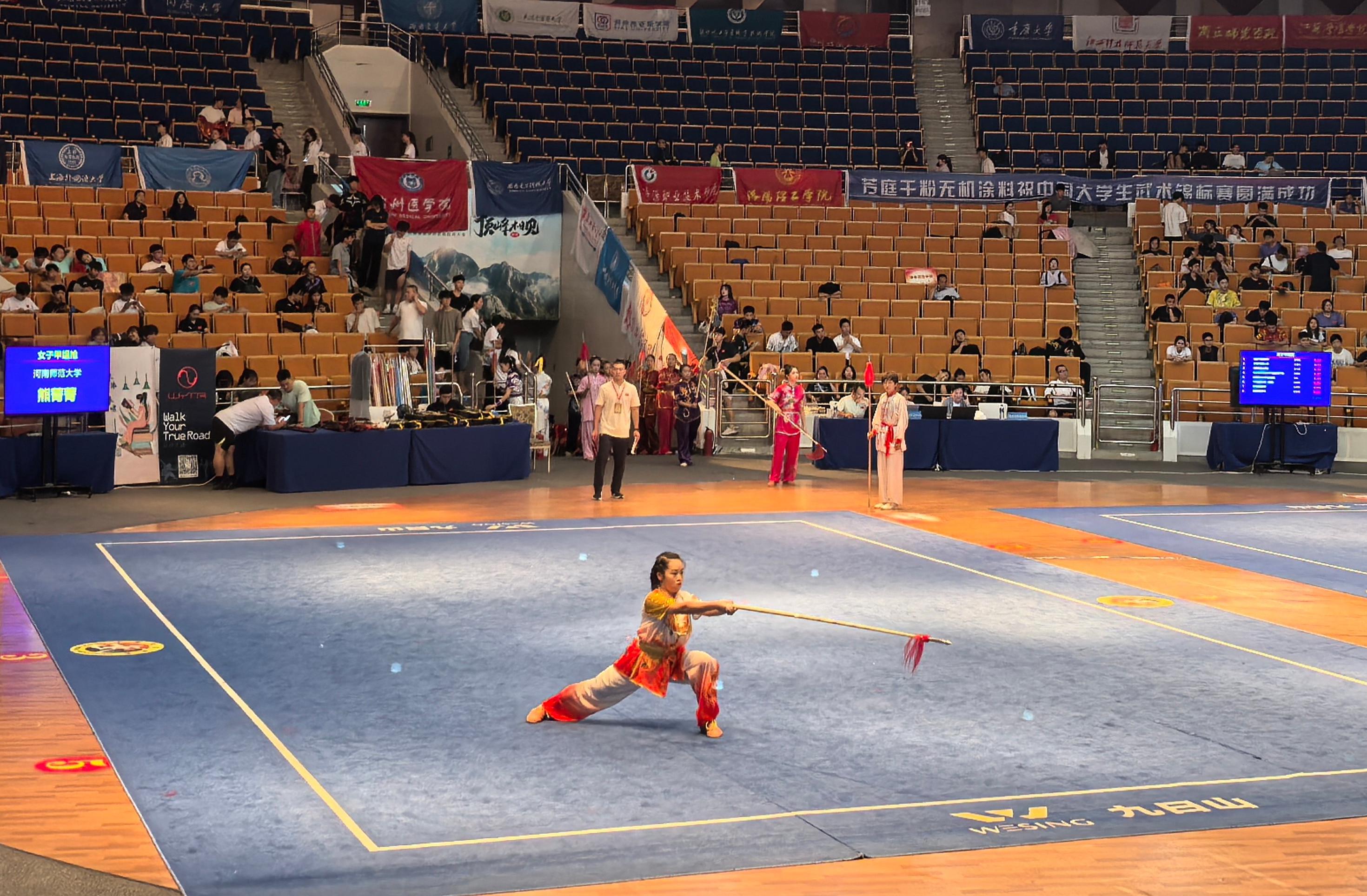 本届赛事由中国学生体育联合会主办,天津市武术协会承办,吸引了包括中国人民公安大学、中国政法大学、同济大学、浙江大学、西安交通大学等在内的全国各地241所高校的2000余名运动员同台竞技。我校武术代表队由体育学院副院长孟国正任领队,教师李玫红、申典雅、杨姗姗任教练,共派出6名运动员参赛。比赛中,队员们凭借精湛的技艺和稳定的发挥,在多个项目中取得历史性突破:体育学院2023级王博荣获男子甲组三节棍项目首金,体育学院2022级陈虹兆获得男子甲组其它传统太极拳第一名、太极大刀第七名,音乐舞蹈学院2022级魏亚魁在男子甲组太极刀和华拳项目中获一金一铜,法学院2022级熊菁菁获得女子甲组枪术季军,电子与电气工程学院2024级苏圣书获得男子甲组陈式太极拳第五名。