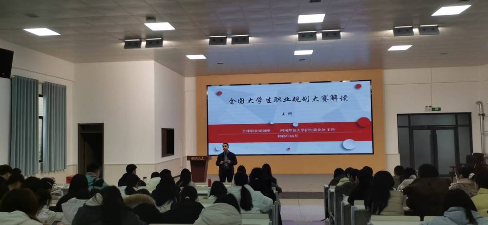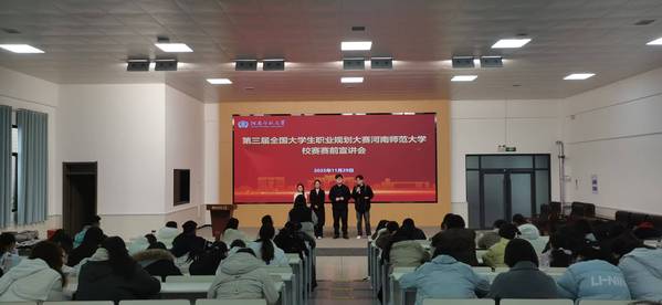11月29日,招生就业处在万人餐厅三楼树惠堂举办第三届全国大学生职业规划大赛河南师范大学校赛赛前宣讲活动,特邀第二届省赛获奖选手及专业指导教师分享备赛经验和要点。招生就业处相关负责人、各学院(部)及书院师生代表300余人参加了此次活动。