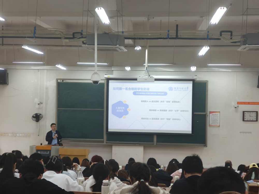 孙晓老师则以《助力成长,赋能未来——学生助理的成长与未来发展》为题,系统梳理了学生助理在视野、人脉、试错、信息、能力等方面的“成长红利”。他提出,学生助理既是学校管理的助手、师生沟通的桥梁,更是“以最小成本犯最有价值错误”的职场预演平台。围绕“沟通力、统筹力、职业力”三个维度,孙老师生动演绎了如何从“传声筒”成长为“翻译官”、从“单线程”进阶为“多线程”、从“学生气”蜕变为“职业范”。他鼓励同学们在服务他人中实现最高层次的自我成长,把琐碎的工作变成通往专业的必经之路。