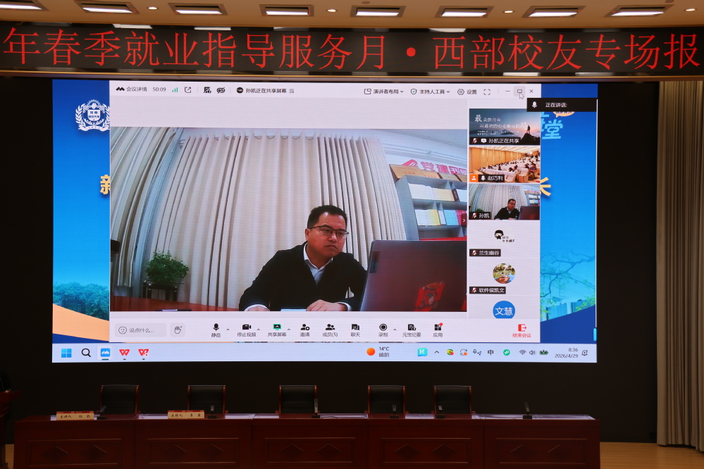 4月29日,2026年春季就业指导服务月西部校友专场报告会在我校求真楼5楼东报告厅圆满举办。本次活动特邀新疆维吾尔自治区皮山县委常委、组织部部长孙凯主讲,主题为“最美的青春,用最初的心走最远的路”。招生就业处副处长李霜、副处长徐新豪出席报告会,招生就业处相关工作人员及200余名师生参与了此次活动,报告会由副处长李霜主持。