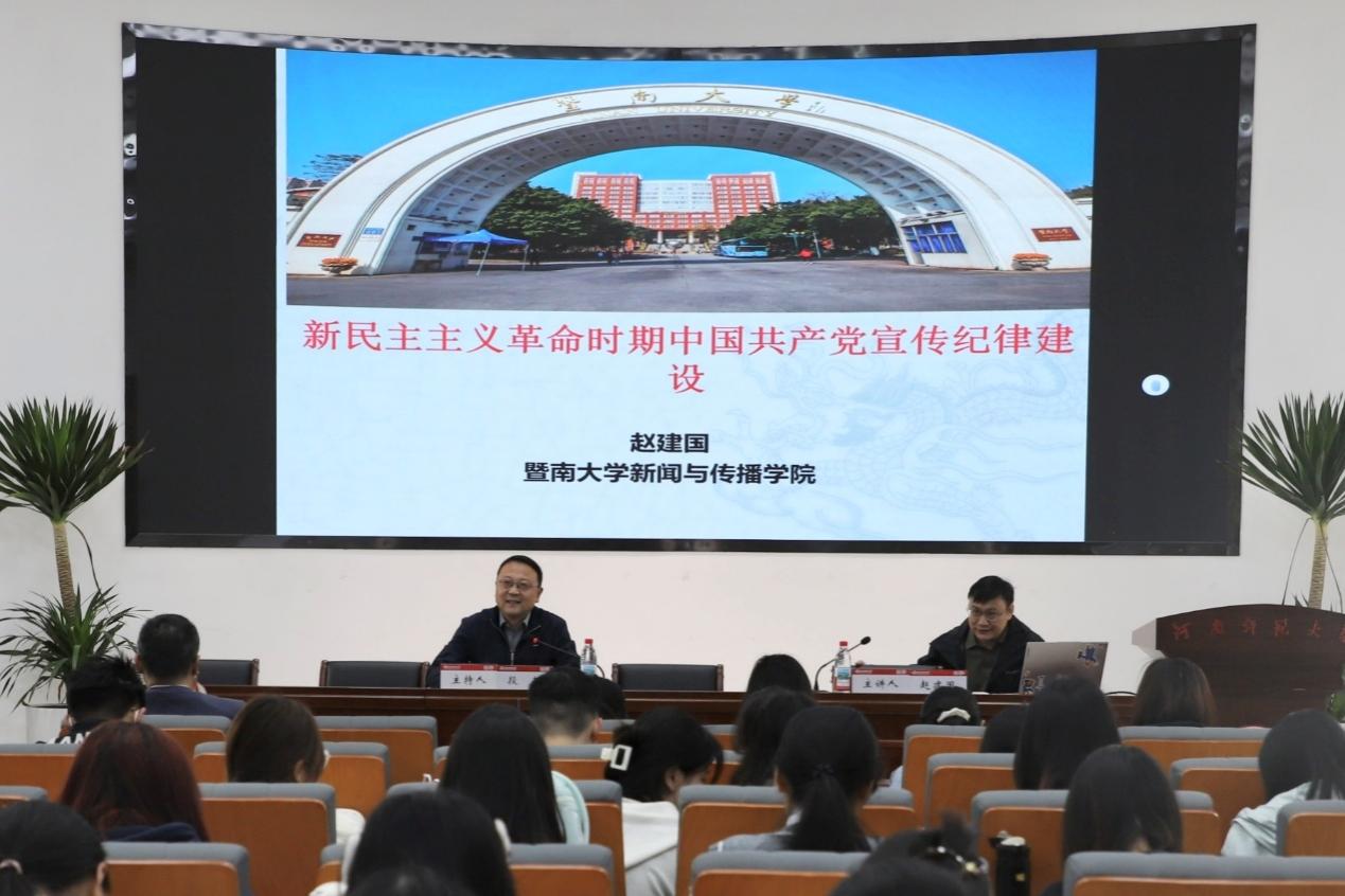 4月14日上午,暨南大学赵建国教授应邀做客“卫风讲堂”,在崇文楼一楼报告厅为文学院师生作题为“新民主主义革命时期中国共产党宣传纪律建设”的专题讲座。讲座由新闻学与传播学学科带头人段勃教授主持,八十余名师生参加学习。