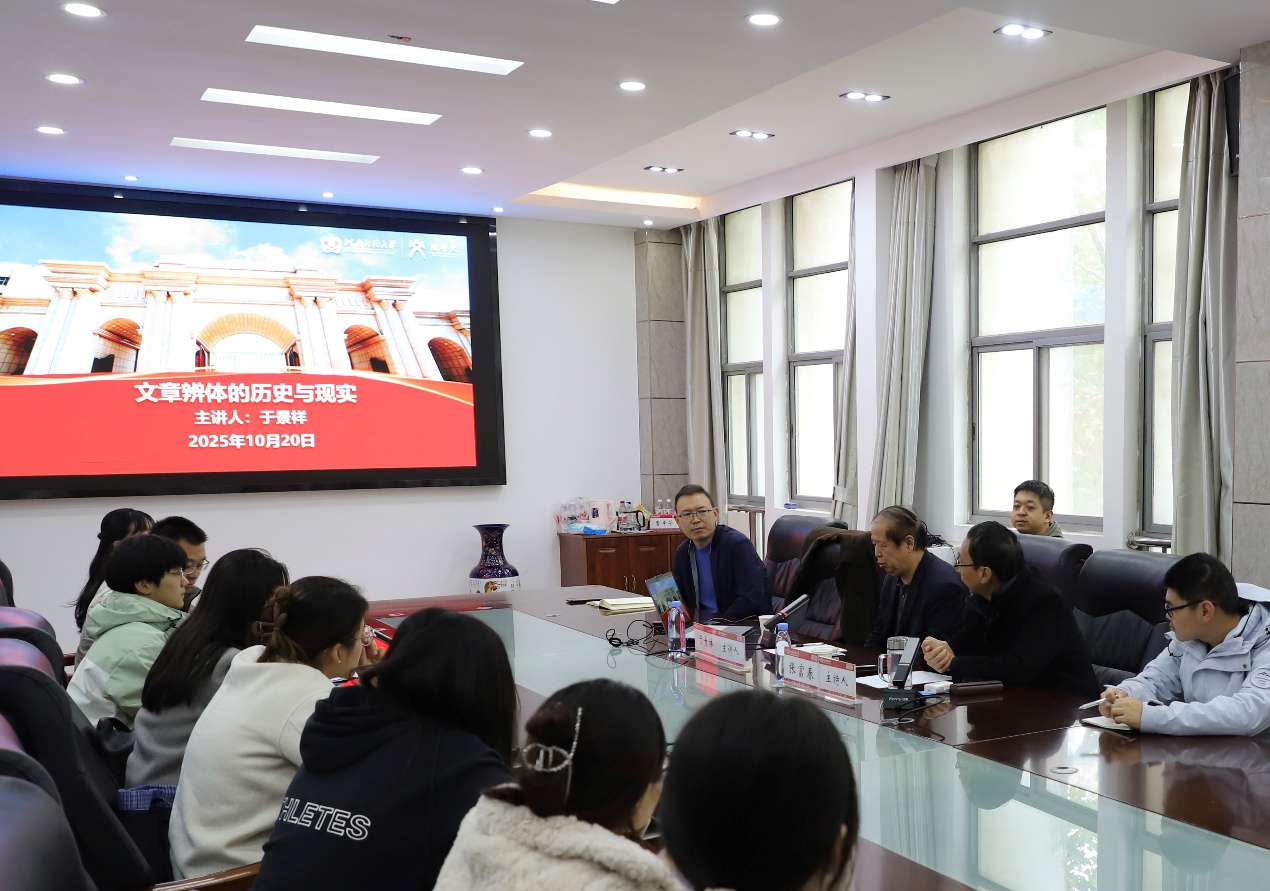 10月20日上午,内蒙古民族大学于景祥教授应邀做客“卫风讲堂”,于崇文楼二楼会议室为文学院师生作题“文章辨体的历史与现实”。讲座由文学院古代文学教研室主任张富春教授主持,学院40余名学生积极参与学习。