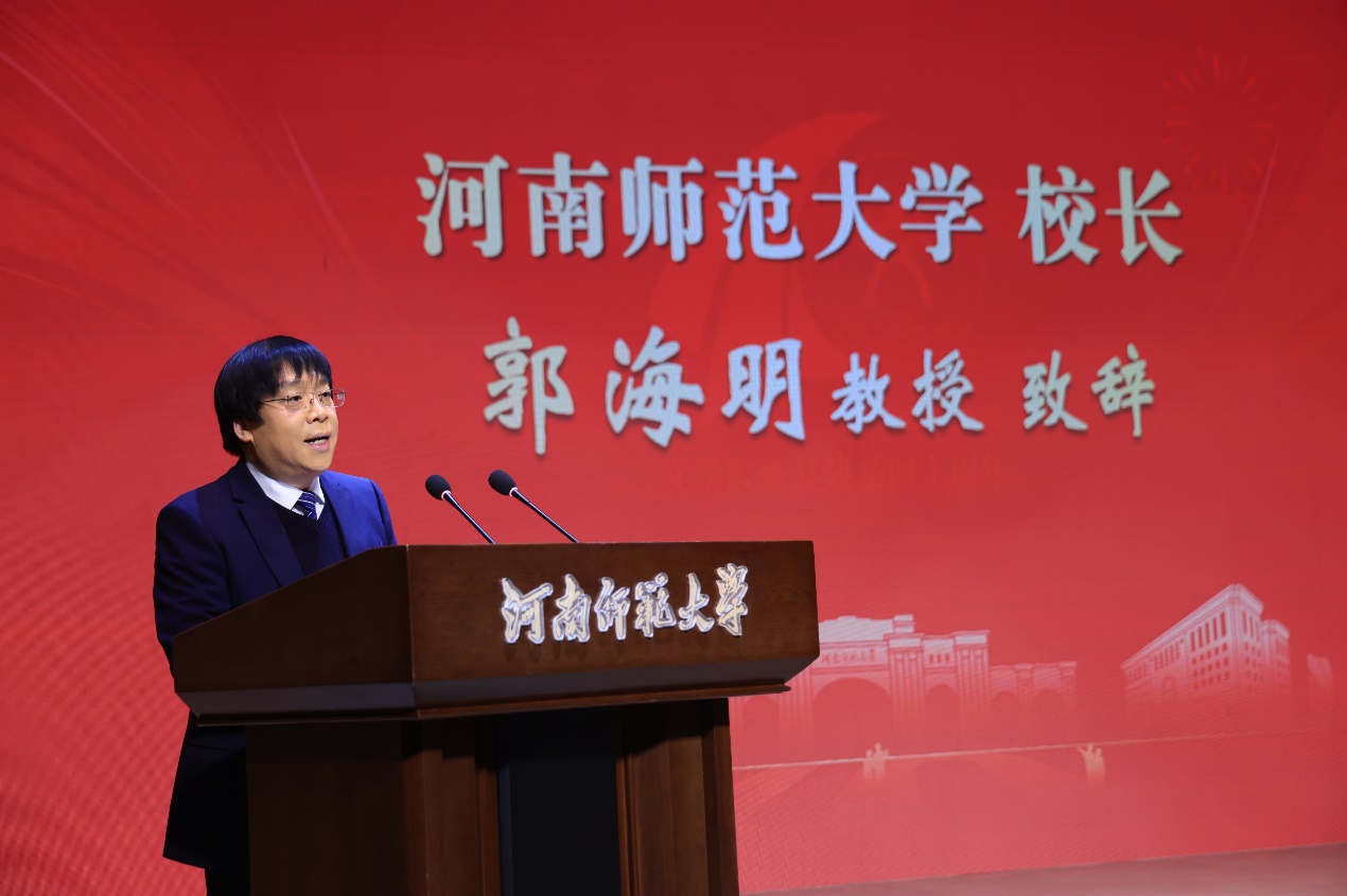 校长郭海明致辞。他总结介绍了学校百年发展历程和发展成就。他指出,文学院作为学校人文底蕴的重要承载者,四十年间已从“文科大院”迈向“文科强院”,在专业建设、课程体系、学科布局、师资队伍和科研项目等方面均取得显著成就。面向未来,他对文学院提出三点希望:一是发挥专业优势,打造中华优秀传统文化传承与传播的中心;二是彰显教师教育特色,建设“豫派名师”孵化培育基地;三是响应国家高教发展战略,构建学科交叉研究高地。他强调,学校将坚持立德树人根本任务,深化交叉融合,推动高质量发展,并诚挚欢迎校友常回母校,共筑师大美好明天。