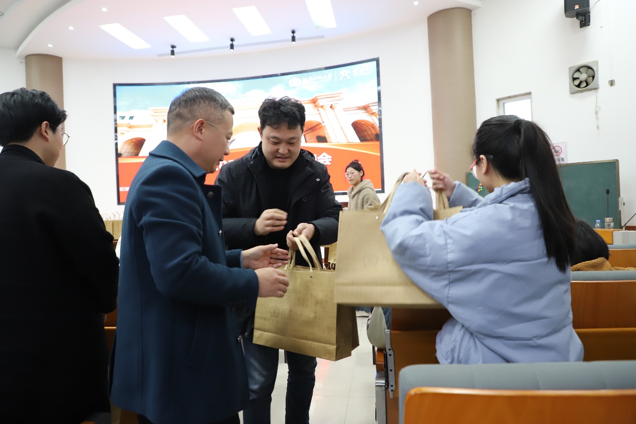 陈鹏亲切询问同学们的复习进度与心理状态,勉励大家锚定目标、稳扎稳打,严格执行备考计划,充分发挥自身优势,保持专注投入的应考状态,做到张弛有度、科学备考。他强调,学院始终是同学们的坚强后盾,备考期间如遇困难或需求,请及时与学院沟通,学院将全力予以支持,为考研学子保驾护航。随后,老师们共同为考研学子发放了精心筹备的 “考研助力大礼包”。礼包内含寓意 “备考思路旺、答题发挥旺、一路开挂旺”的旺仔牛奶,象征“心想事成、成功上岸”的新鲜橙子,兼具“暖心暖身、舒缓焦虑”功能的暖宝宝,以及承载“视觉赋能、好运加持”美好祝愿的“逢考必过”主题装饰画等十类礼品,既饱含学院对学子们的真挚关怀,更寄托了“十全十美、金榜题名”的殷切期盼。