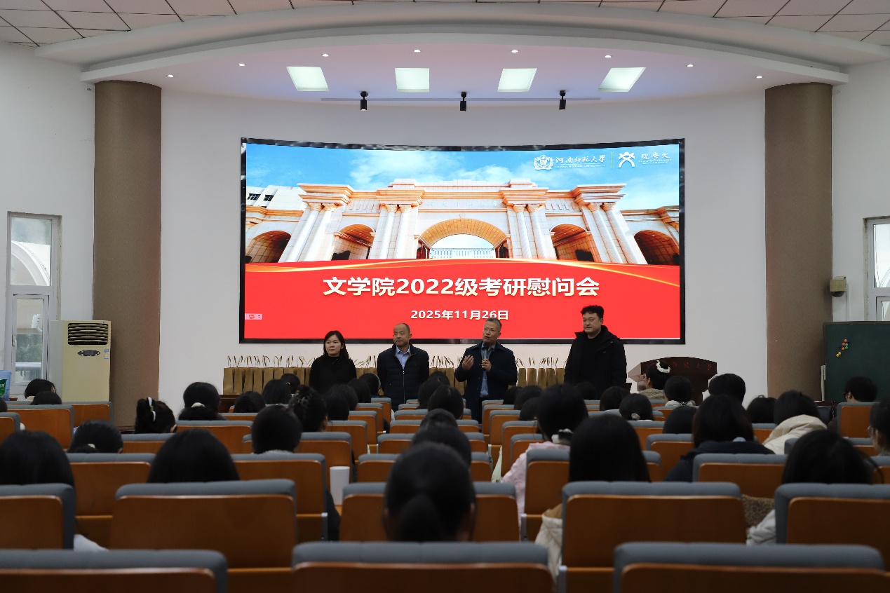 为帮助考研学子增强考研信心,缓解备考压力,11月26日下午,文学院在崇文楼一楼报告厅开展2022级考研慰问活动,院长陈鹏、党委副书记张颜勇出席活动,毕业班专兼辅导员以及2022级考研学生共同参与。
