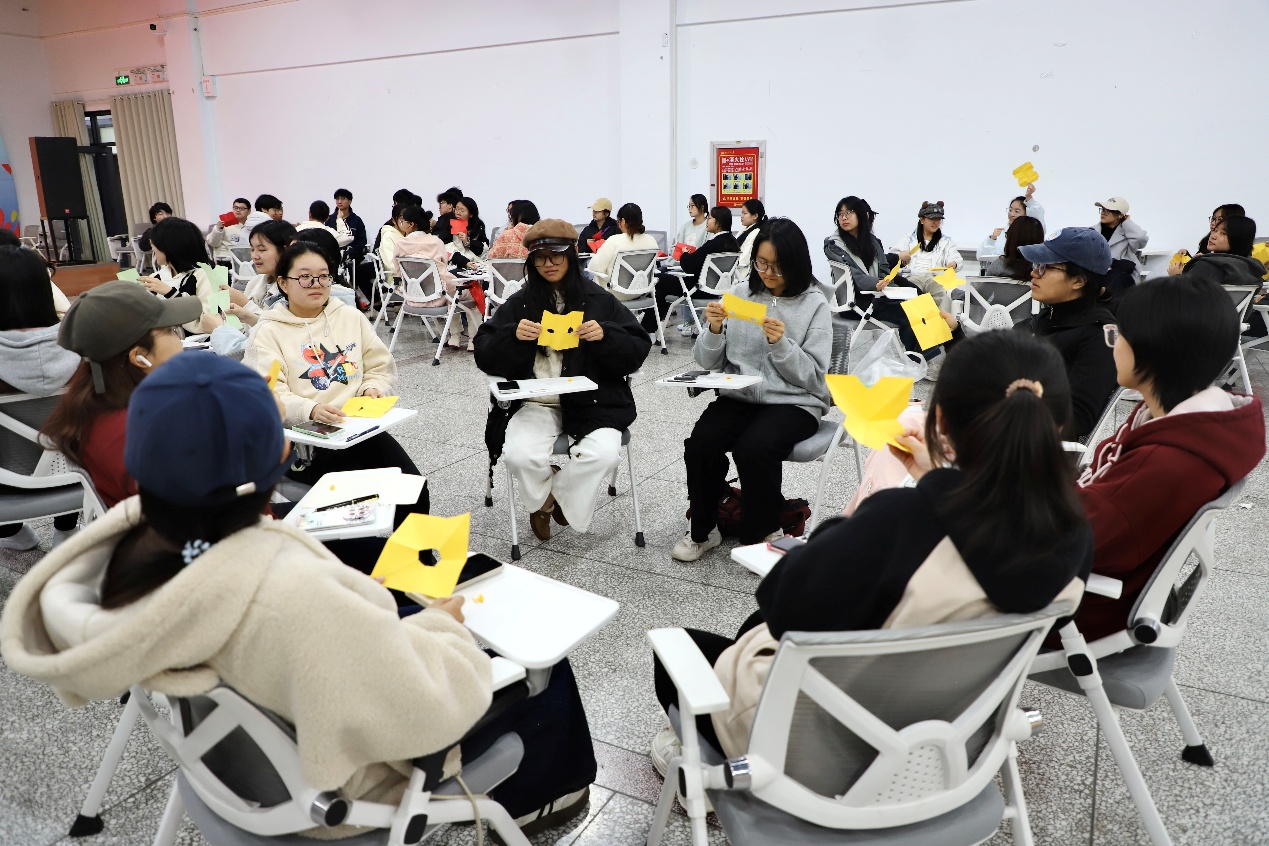 活动伊始,李秀萍将学生分为九组,通过“击鼓传花”“撕纸游戏”“自我探索答题卡”等环节,逐步引导学生在轻松氛围中敞开心扉。在“击鼓传花”环节中,学生以即兴演唱、拥抱等互动形式,有效打破了彼此的陌生感,快速建立信任。“撕纸游戏”中,她结合统一指令下产生不同结果的现象,启发学生认识到清晰表达与双向交流在人际交往中的重要性。“自我探索答题卡”环节则聚焦内在认知,学生通过选择代表自己的动植物与乐器,深入探索并表达内心世界,进一步深化对自我的理解。李秀萍引导学生将宿舍矛盾、容貌焦虑、学习压力等现实困扰匿名书写并投入“烦恼箱”,再以小组讨论的形式共同探讨解决方案。她带领学生宣誓并总结,鼓励在座学生将活动中的收获融入日常生活,以积极乐观的心态迎接未来的挑战。