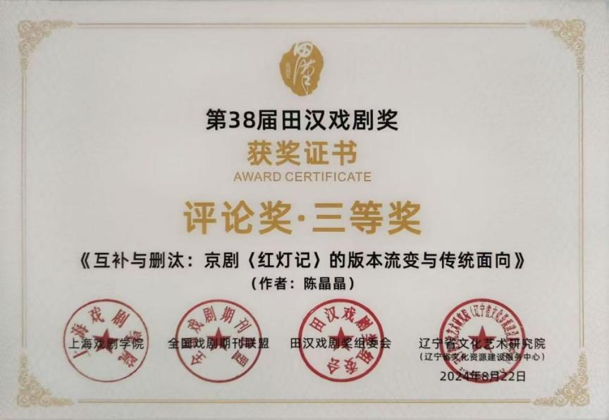 2024年8月,由上海戏剧学院、全国戏剧期刊联盟、田汉戏剧奖组委会、辽宁省文化艺术研究院联合主办,《新世纪剧坛》编辑部承办的第38届田汉戏剧奖评选揭晓,我院青年教师陈晶晶副教授荣获“评论奖”三等奖,获奖论文题为《互补与删汰:京剧红灯记的版本流变与传统面向》。