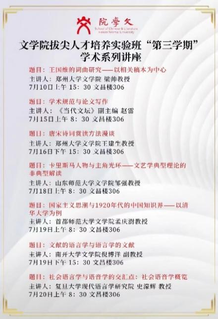 教学名师团队形成雁阵效应。学院现有中原名师1人,省高校教学名师4人,省教学标兵12人,省师德标兵2人,1名教师荣登“中国好人榜”,1名教师获评河南省最美教师,多名教师在省级教学竞赛中斩获佳绩。学院还积极利用学校“银铃计划”政策,聘请中山大学康保成教授、中国人民大学程光炜教授等知名学者来院任职,师资力量厚重坚实。