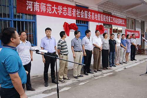 史战芳和王慧敏共同为“河南师范大学志愿者社会服务基地”揭牌,我校医院院长朱命祺和吴村镇党委书记孙喜梅共同为“河南师范大学医院专家工作站”揭牌。