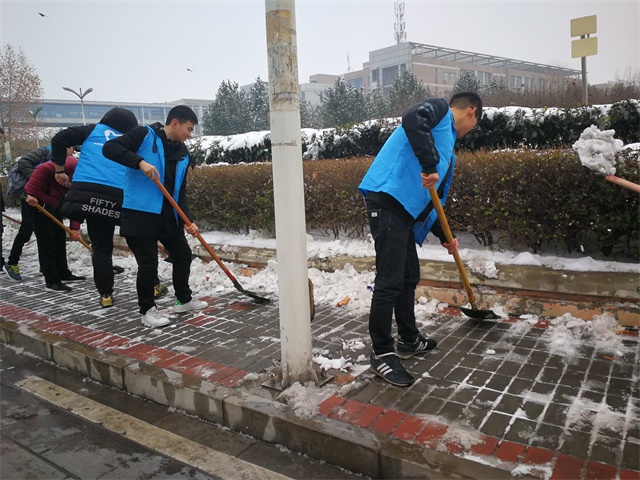 2018年新乡的第一场雪飘然而至,大地万物瞬间银装素裹,在给同学们增添乐趣的同时,厚厚的积雪也给大家出行带来了诸多不便。为确保道路安全畅通,方便学生出行,1月7日下午,计算机与信息工程学院、软件学院成立清雪志愿服务突击队,突击队由学院团委学生会以及班级学生干部组成。