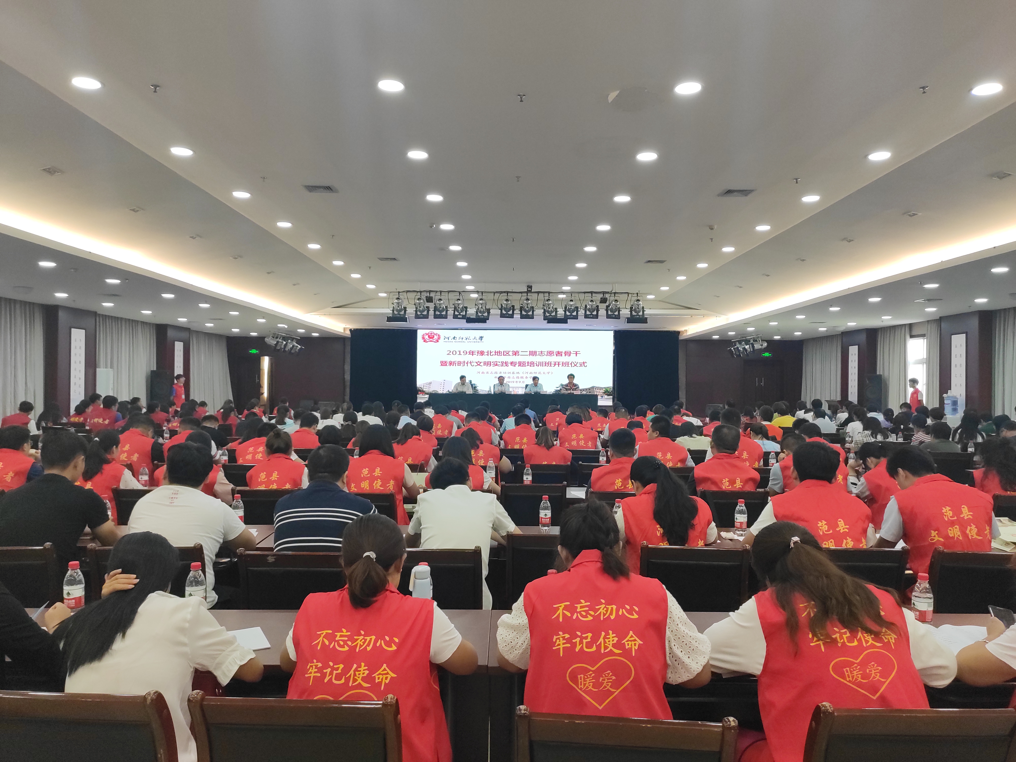 为响应中央宣传部、中央文明办关于建设新时代文明实践中心试点工作专题会议精神,推进志愿服务与新时代文明实践深度融合,河南省志愿者培训基地(河南师范大学)、新乡平原志愿服务学院于9月7日-8日在我校举办2019年第二期志愿者骨干暨新时代文明实践专题培训班。新乡市委宣传部正处级调研员常中宜,党委常委、宣传部部长聂立清,来自新乡、安阳、濮阳三市的志愿者骨干、基层新时代文明实践工作负责人等220余人参与培训。党委宣传部副部长华锋主持仪式。