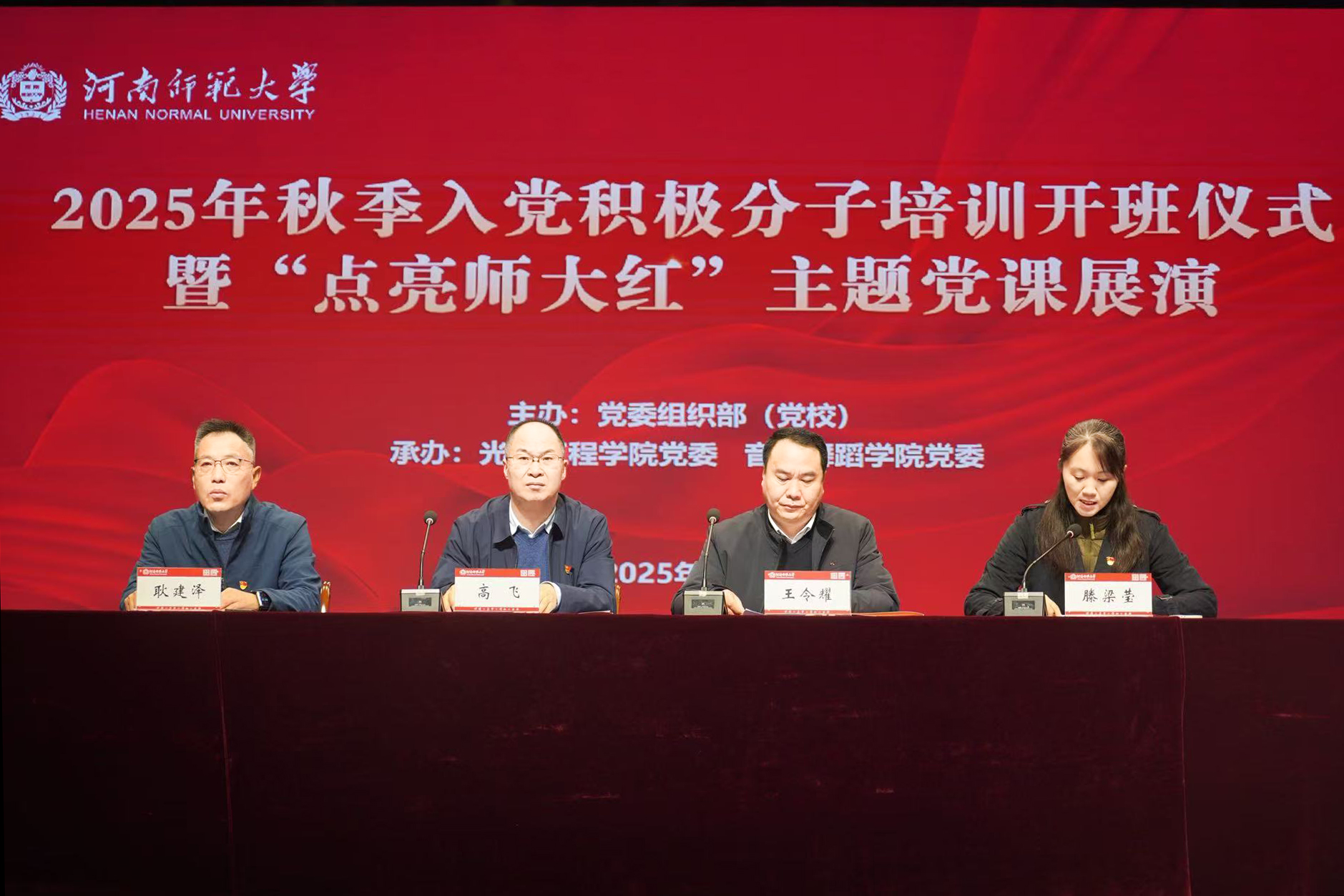 10月25日上午,由校党委组织部(党校)主办、光电工程学院党委、音乐舞蹈学院党委承办的2025年秋季入党积极分子培训开班仪式暨“点亮师大红”主题党课展演在学苑餐厅三楼青益空间顺利举行。校党委组织部(党校)、光电工程学院党委、音乐舞蹈学院党委相关单位负责人出席活动,各分党校近1100名入党积极分子通过线上线下相结合的方式参加了本次活动,平原湖校区和科技创新港校区大一新生通过线上的方式观看了“点亮师大红”主题党课展演。活动由音乐舞蹈学院党委副书记滕梁莹主持。